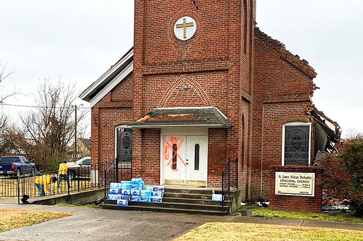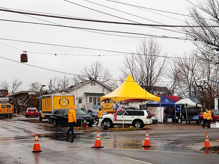 Un furgone carico di generatori, stufette e taniche di propano, 100 in tutto, è arrivato alla tenda giallo brillante all’angolo tra l’Ottava Strada e Walnut a Mayfield, nel Kentucky. I Ministri Volontari hanno aiutato a scaricare il prezioso contenuto del furgone, che ha poi trovato sistemazione quel giorno, così come 2.900 pasti caldi distribuiti dai volontari.