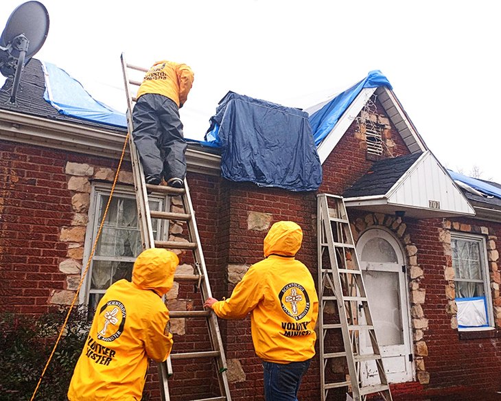 Su richiesta di un pastore la cui chiesa era stata distrutta dal tornado, i VM hanno sgombrato il cortile intorno alla chiesa per poter allestire delle tende per i parrocchiani che avevano bisogno di un riparo. E ogni volta che la pioggia si calma un po’, i volontari si precipitano fuori a posare teloni sui tetti delle case che sono state danneggiate, ma non distrutte.