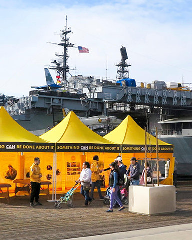 Non solo le Campagne di Benevolenza dei VM viaggiano per tutto il pianeta, ma le Chiese di Scientology organizzano anche tende di VM nella propria città. San Diego lo ha fatto e le punte gialle della tenda hanno adornato nella stessa giornata il molo vicino alla portaerei USS Midway, principale destinazione turistica di San Diego, e il popolarissimo Balboa Park. La USS Midway, un’ex portaerei, è ora un museo navale, al sesto posto nell’elenco dei principali musei statunitensi da visitare.